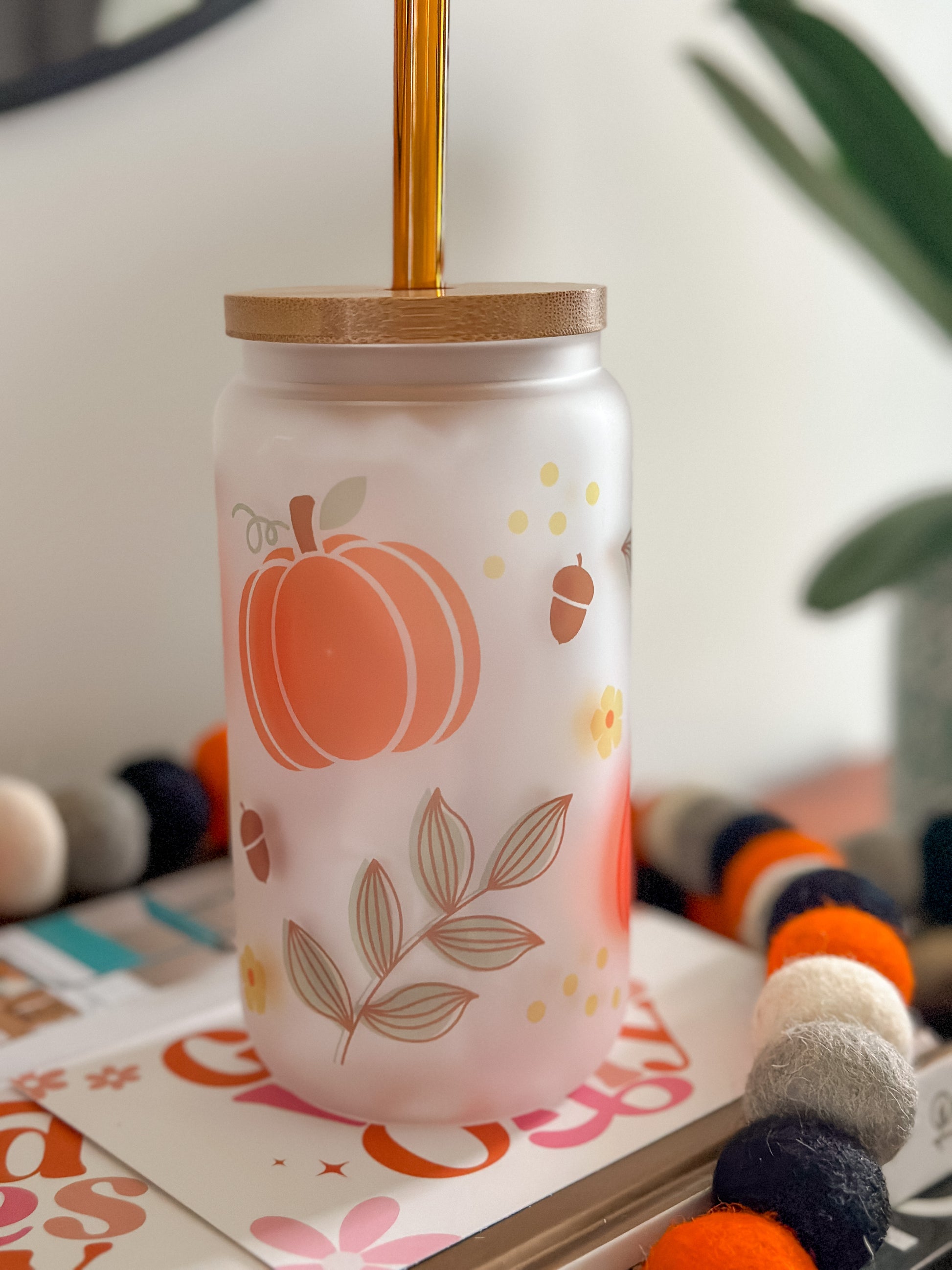 Elevate your fall vibes with our 16oz frosted glass tumbler featuring charming pumpkins and leaves, making it the perfect seasonal companion. Crafted for both style and functionality, this tumbler comes with a snug and leak-proof bamboo lid, ensuring your beverages stay secure and your sips spill-free. Sip in style and celebrate the season with this must-have fall accessory.