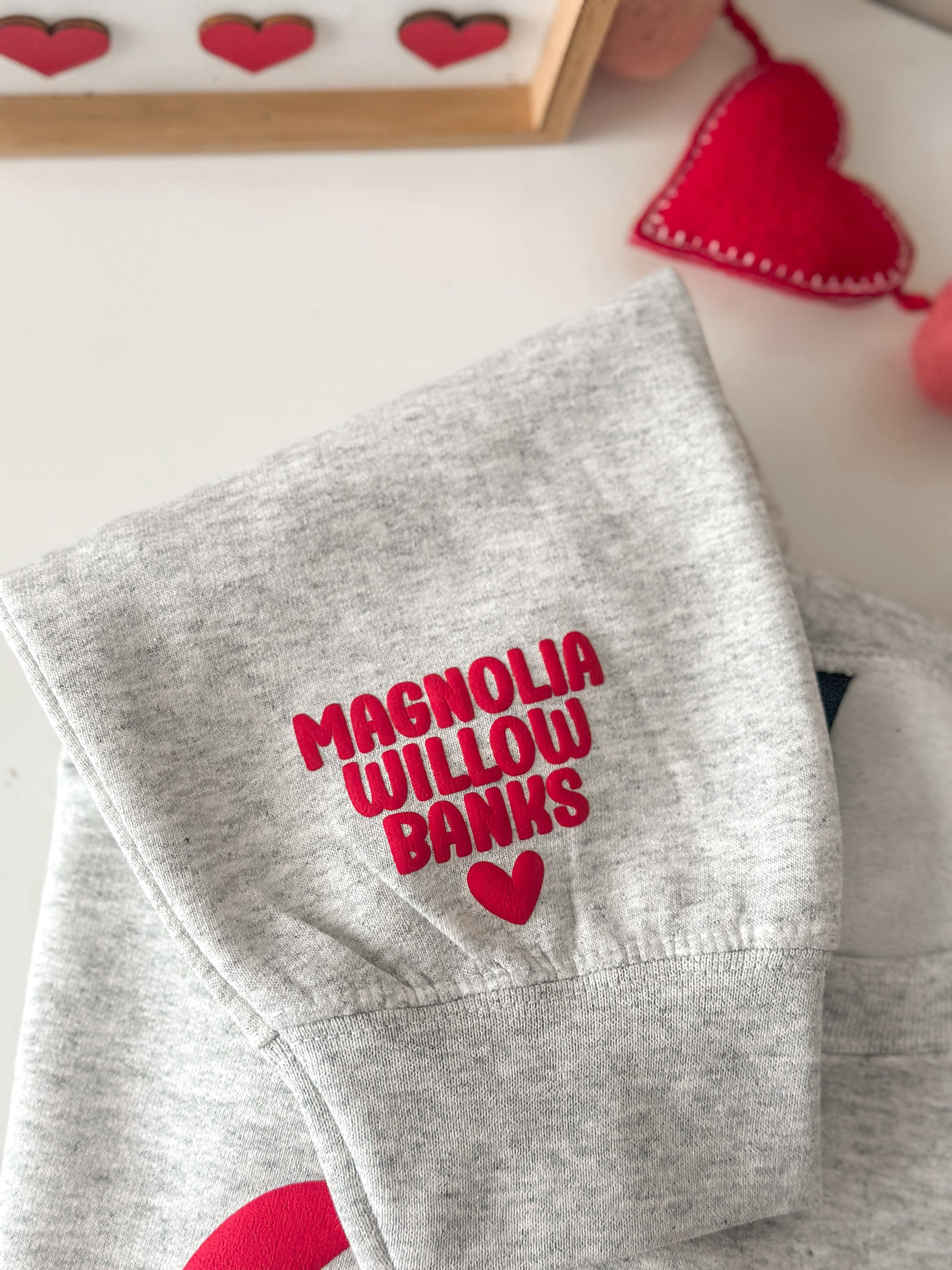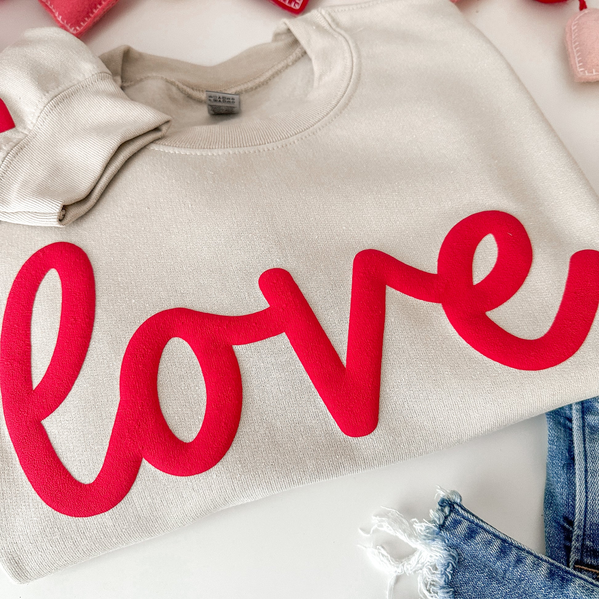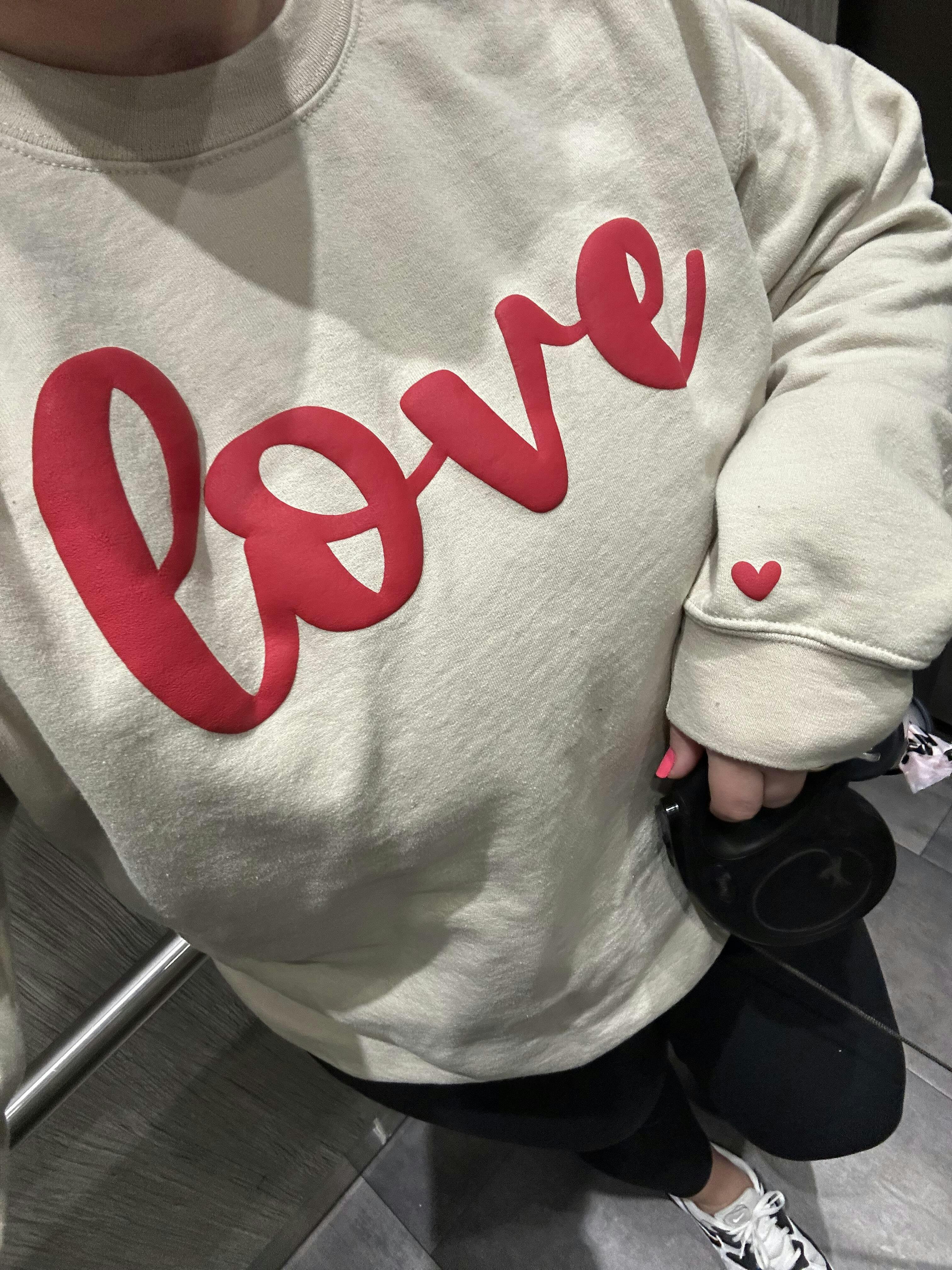 Wrap yourself in love this Valentine’s Day with our cozy Love Sweatshirt with 3D puff print "LOVE" design on the front and a sweet heart detail on the sleeve, this sweatshirt is the perfect blend of comfort and charm.