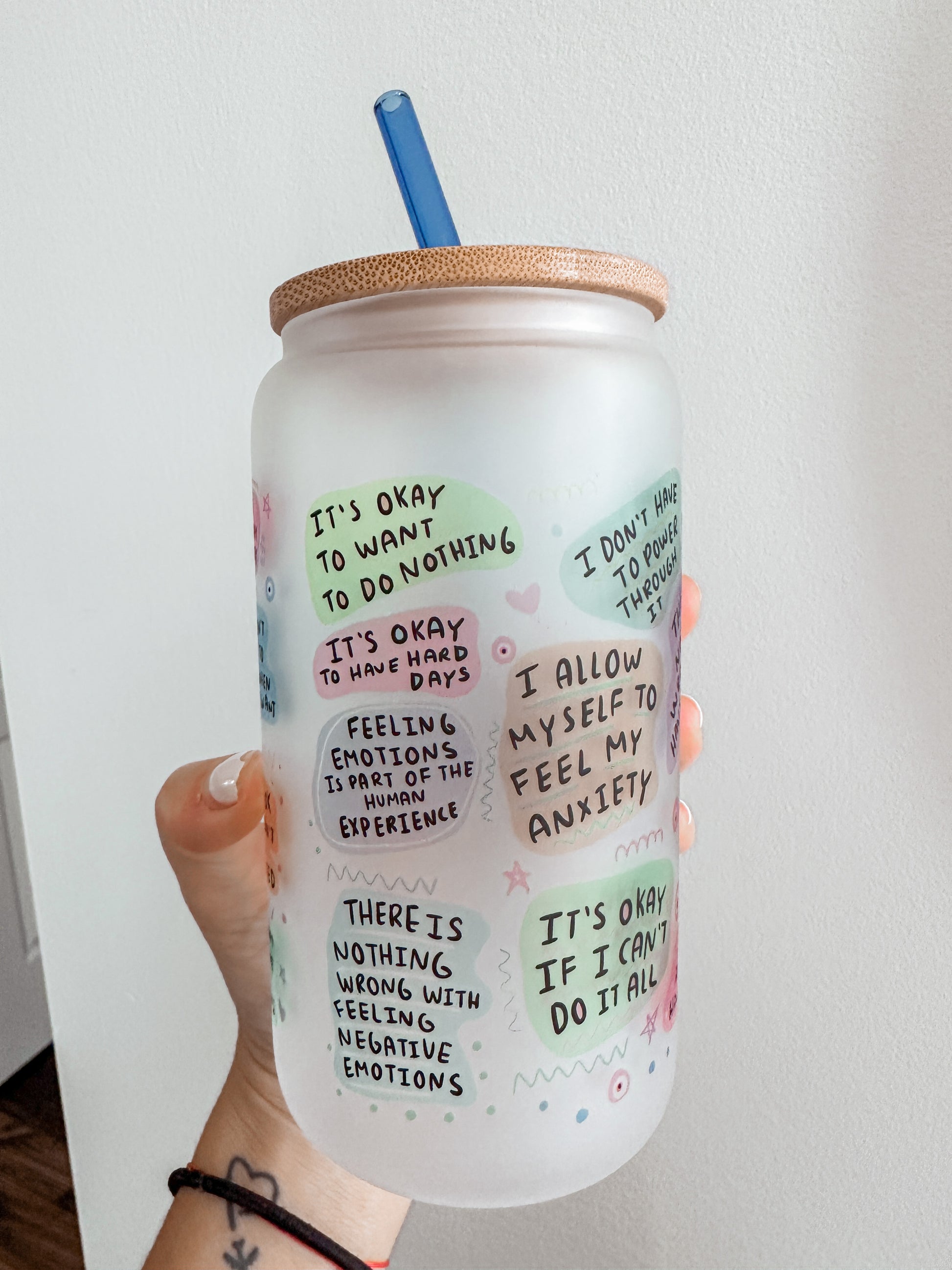 16oz frosted glass beer can comes with a bamboo lid and straw. The bamboo lid includes a sleek proof silicone sleeve which seals your drink in the glasses and prevents leaks.